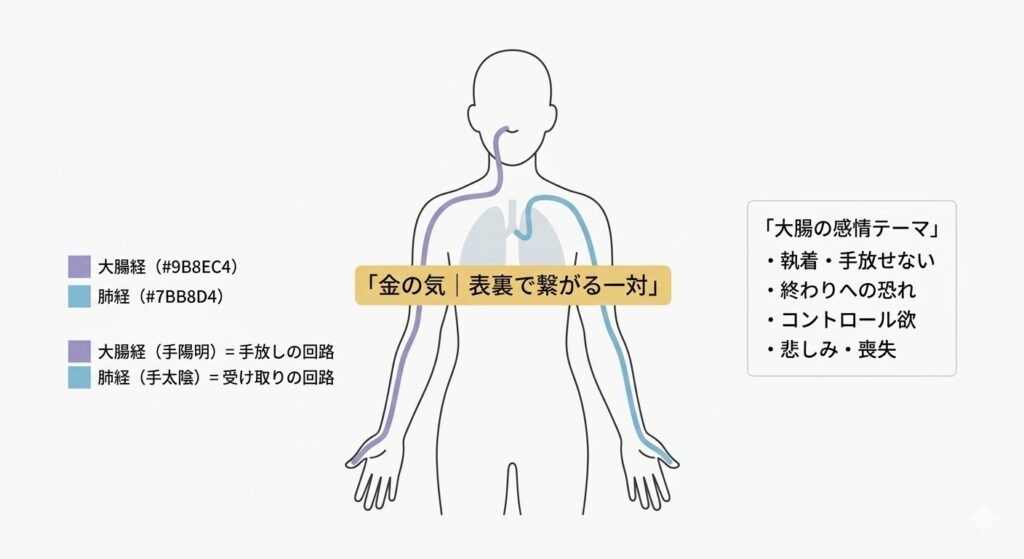 この表裏の関係で見ると、大腸の不調は「手放せない」だけの問題ではありません。肺経との繋がりから「受け取ることへの恐れ」「新しいものを吸収できない」という意味も含まれてきます。