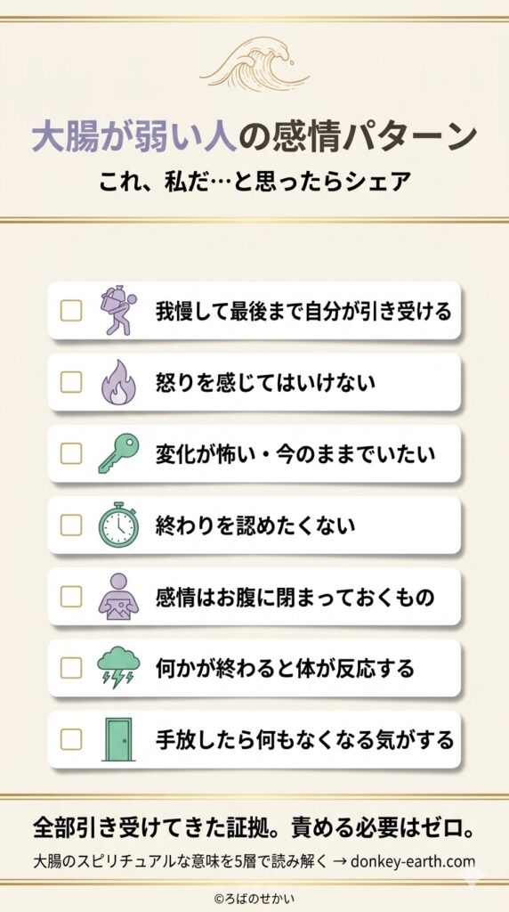 家系カルマの視点から見ると、先祖が「手放したことで失った」体験を持っていると、その記憶が遺伝の層に刻まれます。「手放すと死ぬ」「我慢して生き延びてきた」という家系のパターンが、今のあなたの大腸を通して出てきているとしたら——それはあなたの代で解放できる、という魂のタイミングです。