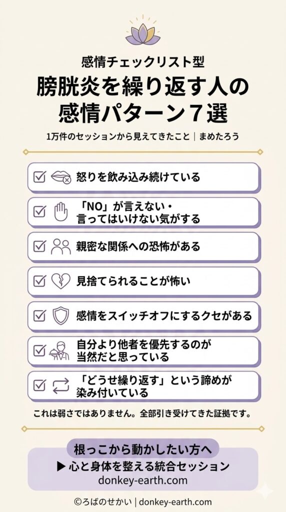 膀胱炎は「消すべき問題」ではありません。溜め込んできた感情・信念・魂のパターンが「もう手放していい」と教えてくれているサインです。