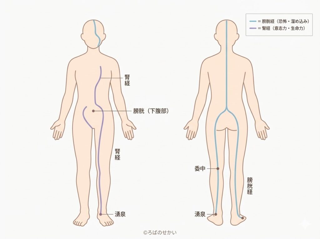 『黄帝内経』には「腎は恐を主る」という記述があります。恐怖・驚き・慢性的な不安が腎気を消耗させ、その影響が膀胱経にも及ぶという考え方です。