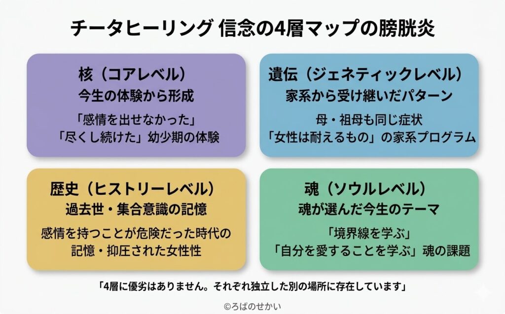 東洋医学では恐怖と意志力の臓器として、アストラル体では感情の溜め込みとして、メンタル体では「NOと言えない」「愛されるために尽くす」という信念として、コーザル体では家系から受け継いだ「我慢が美徳」というプログラムとして——それぞれの層が重なり合って、あなたの膀胱に炎症というメッセージを届けています。