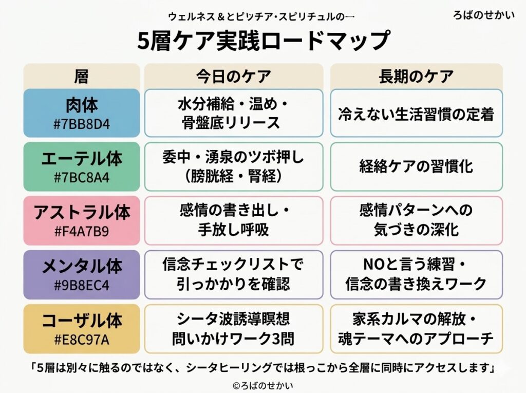 | 肉体・エーテル体 | 水分・温め・ツボ押し・骨盤底リリース | 身体・経絡レベルのエネルギーの詰まりへのアクセス |