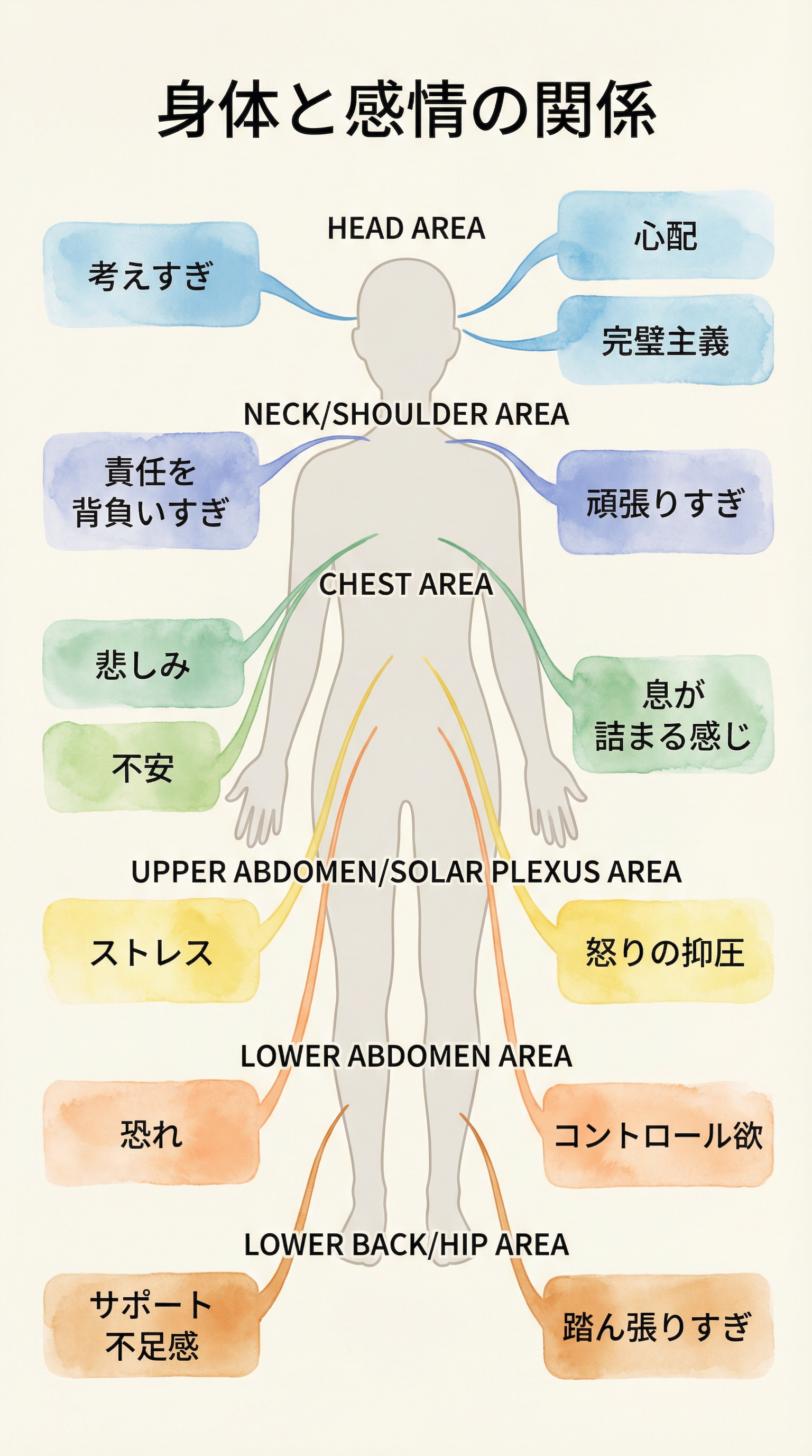 感情(特に古いトラウマや抑圧された感情)は筋膜に記憶されるという見解もあり、この筋膜の硬さが慢性的な疲労感・重だるさとして現れることがあります。