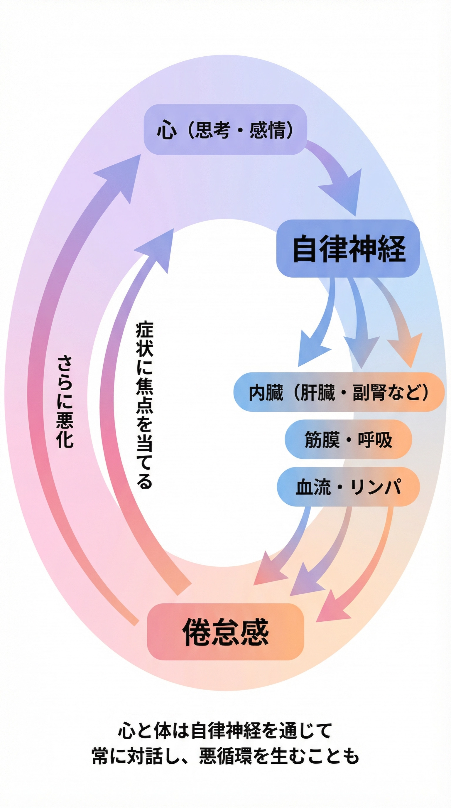 倦怠感が続く理由は、実は「体だけ」「心だけ」で説明できないことがほとんど。体で起きていることと、心で起きていることが、複雑に絡み合っています。