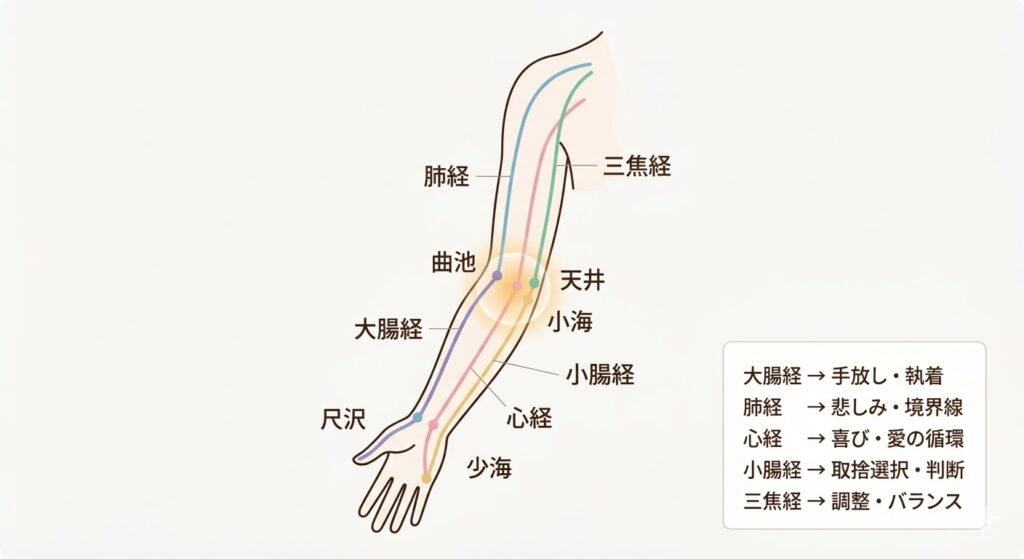 東洋医学では、肘は複数の重要な経絡が交差・通過する「感情の分岐点」として位置づけられています。