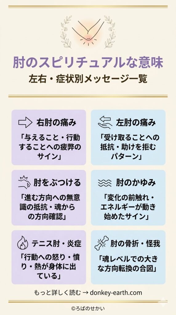 | 肘をよくぶつける | 進もうとしている方向への無意識の抵抗。「本当にこっちでいいのか」という魂からの問い |