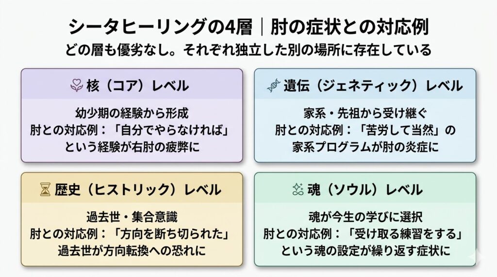肘の症状を維持しているプログラムは、意識の届かない場所——潜在意識・遺伝・過去世の層——に埋め込まれていることがほとんどです。だからアファメーションだけでは届かない。