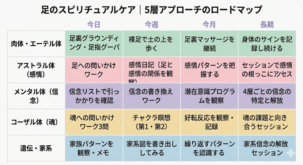 どの層から見ても、足が送ってくるメッセージの本質は同じです。「あなたは今ここにいていい。根を張っていい。前に進んでいい」——そのことを、自分の身体が一番深いところから伝えようとしています。