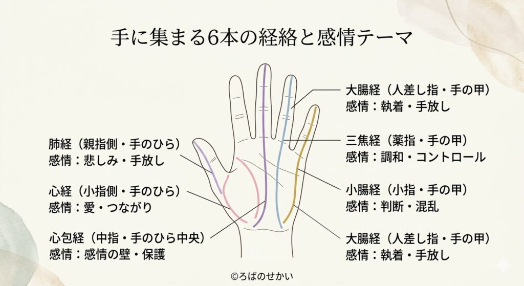 全身を走る12本の正経のうち、実に6本が腕から手に通過しています。肺・心・心包・三焦・小腸・大腸——これだけの臓腑エネルギーが手に集まっているということは、「どの感情テーマが滞っているか」を特定する上で、手は非常に重要な情報源だということです。