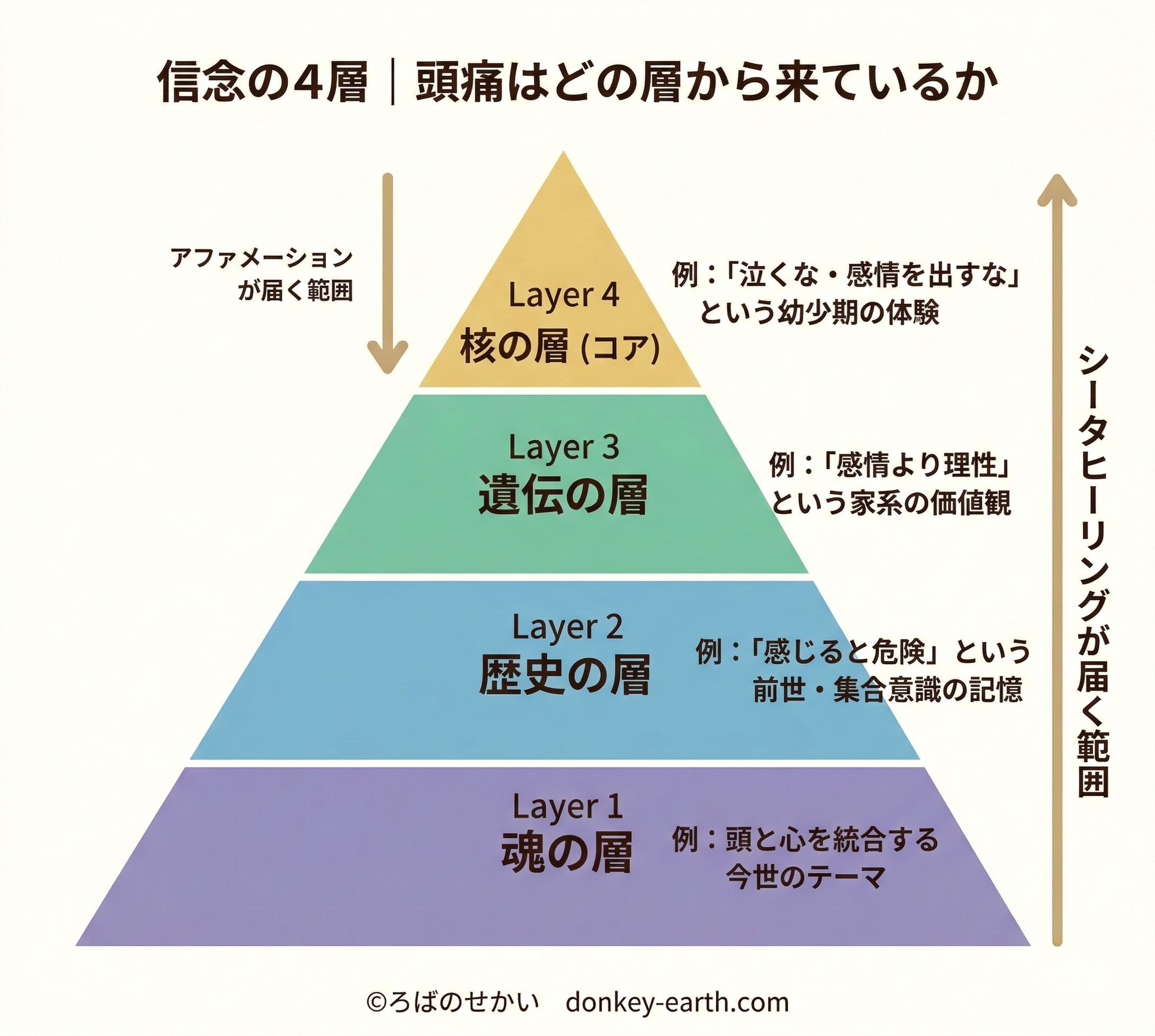 頭痛のスピリチュアルな意味は、場所・タイミング・繰り返しのパターンによってまったく違います。そしてそれは、感情の層だけじゃなく、信念の層・魂の層・創造主の視点まで掘っていかないと、本当の答えには届かない。