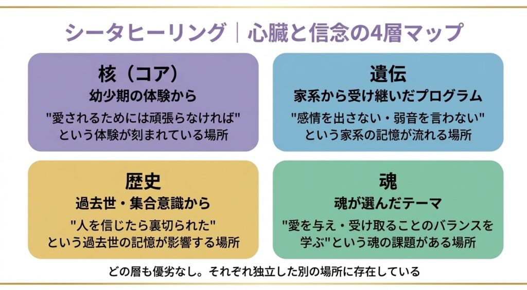 シータヒーリングのセッションでは、この信念の書き換えをより根の部分から、4層にわたって行います。
