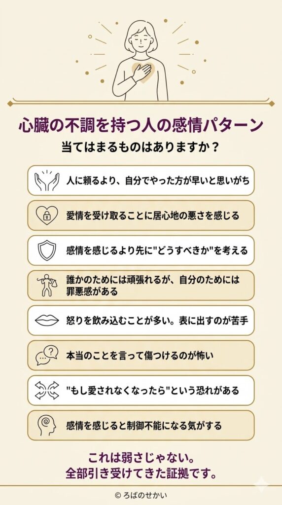 1万件のセッションで繰り返し見えてくる、心臓にサインが出やすい方の感情パターンをまとめます。