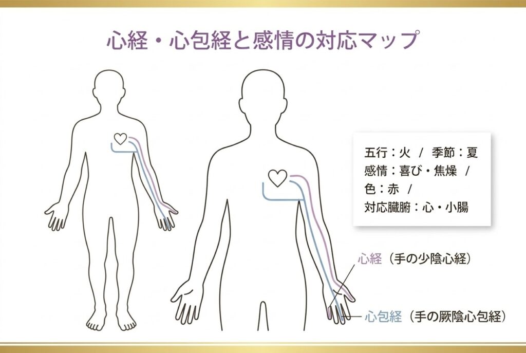 感情的なショックや傷つきは、まず心包経が受け止めます。長期的なストレス・抑圧された感情・愛を受け取れない状態が続くと、心経そのものが影響を受け、胸の痛み・動悸・不眠・焦燥感として身体に出てくるとされています。