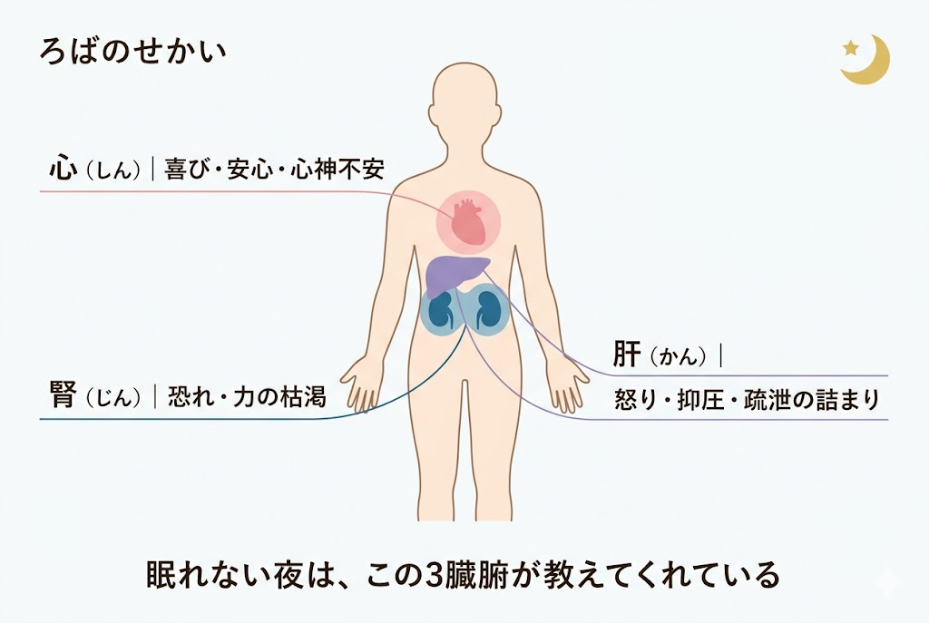 東洋医学の視点では腎・心・肝の経絡が乱れ、感情の層では昼間に感じられなかったものが浮上し、信念の層では「眠っていいと思えない」プログラムが動いている。