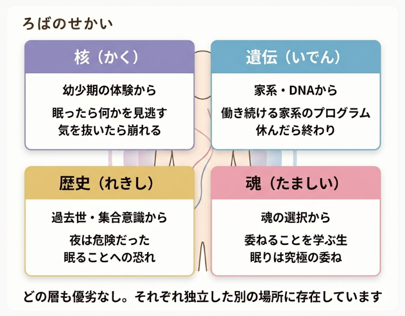 | 「夜中に泣いても来てもらえなかった」「眠ったら何かが変わっていた」という幼少期の体験から「眠ることへの恐れ」が形成される。常に警戒していた子どもは、夜の静寂を「脅威」として学習している | 「働き続ける家系」「戦争や貧困を生き延びた先祖が常に緊張状態でいた」というプログラムが遺伝的に引き継がれている。「休んだら終わり」「隙を見せてはいけない」という信念は個人の記憶ではなく家系全体のパターン |