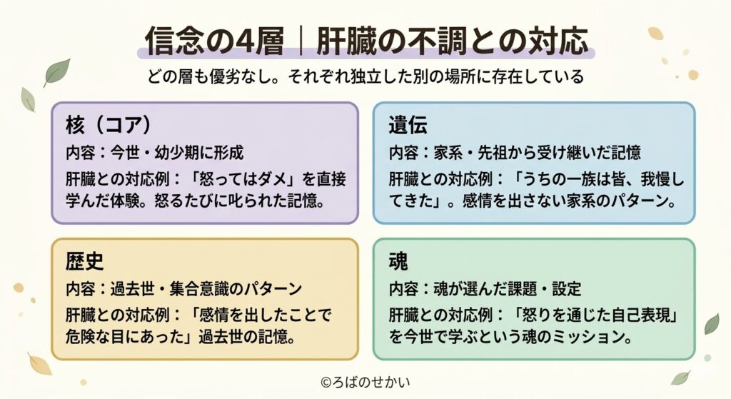 「この人生で、怒りを通じた自己表現を学ぶ」という魂レベルの設定がある場合があります。肝臓の不調が繰り返し・長期間続いている方、「なぜ自分だけこんなに怒りの問題があるのか」と感じている方は、この層に根っこがある可能性があります。