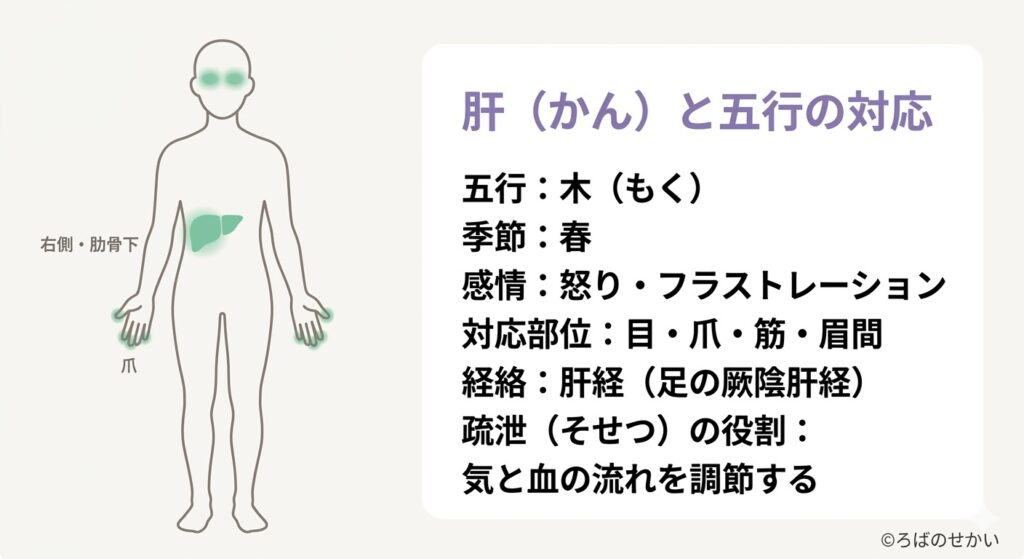 東洋医学では、肝臓は単なる解毒器官ではありません。「肝(かん)」は五行論における「木」行に対応し、春の季節・緑色・酸味・怒りの感情を司るとされています。