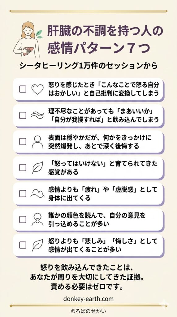 ——こうした体験が「怒り=危険」という信念を作り上げます。肝臓の慢性的な疲労感として現れやすい層です。