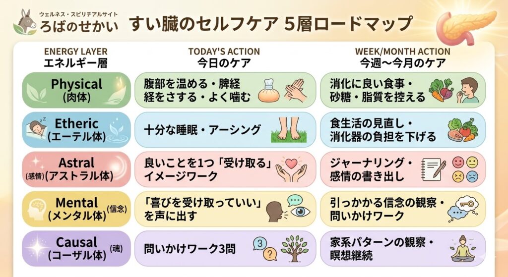 この記事では、膵臓の不調が何を伝えているのかを、東洋医学・アストラル体(感情)・メンタル体(信念)・コーザル体(魂)・創造主の視点まで、5層のエネルギーボディから順番に読み解いていきます。