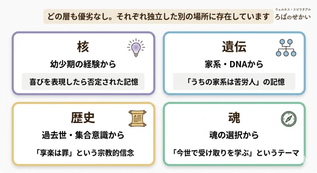 「うちの家系は苦労人だ」「先祖代々、楽はしてはいけない」という遺伝的・家系的なプログラムです。祖父母・曾祖父母が戦時中や極度の貧困の中で「喜びなど贅沢だ」という環境で生きてきた記憶が、DNA情報として引き継がれている場合があります。家族の中で膵臓系の疾患(糖尿病・膵炎)が複数の世代に出ているとき、この遺伝層の信念が関係していることが多い印象です。