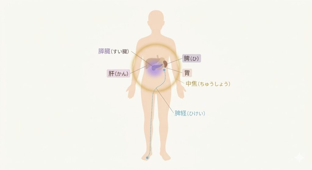 脾・胃・肝胆が位置するエリアを「中焦(ちゅうしょう)」と呼び、ここは気血の変換と流通の中心地です。この中焦のエネルギーが滞ると、身体レベルでは消化不良・血糖不安定・倦怠感が現れ、感情レベルでは「考えすぎ・グルグル思考・心配の多さ」として現れてきます。