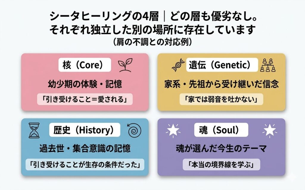 シータヒーリングの4層(核・遺伝・歴史・魂)と肩の関係