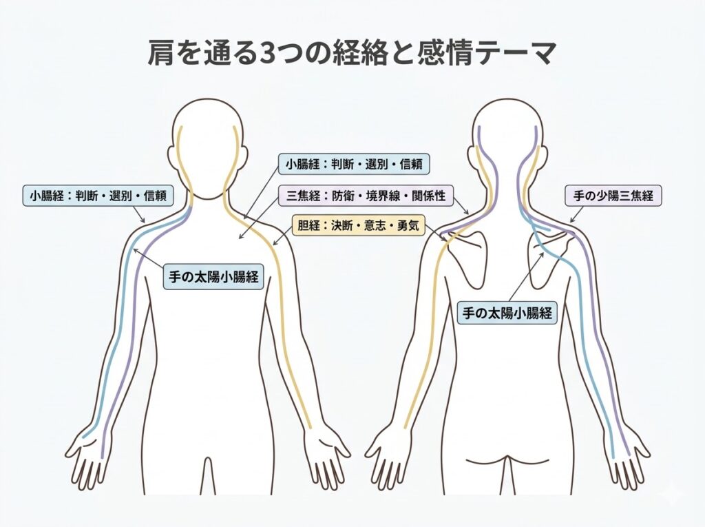 東洋医学では、肩は複数の経絡が交差する「感情の交差点」として扱われます。特に深く関わるのが、手の太陽小腸経・手の少陽三焦経・足の少陽胆経の3つです。