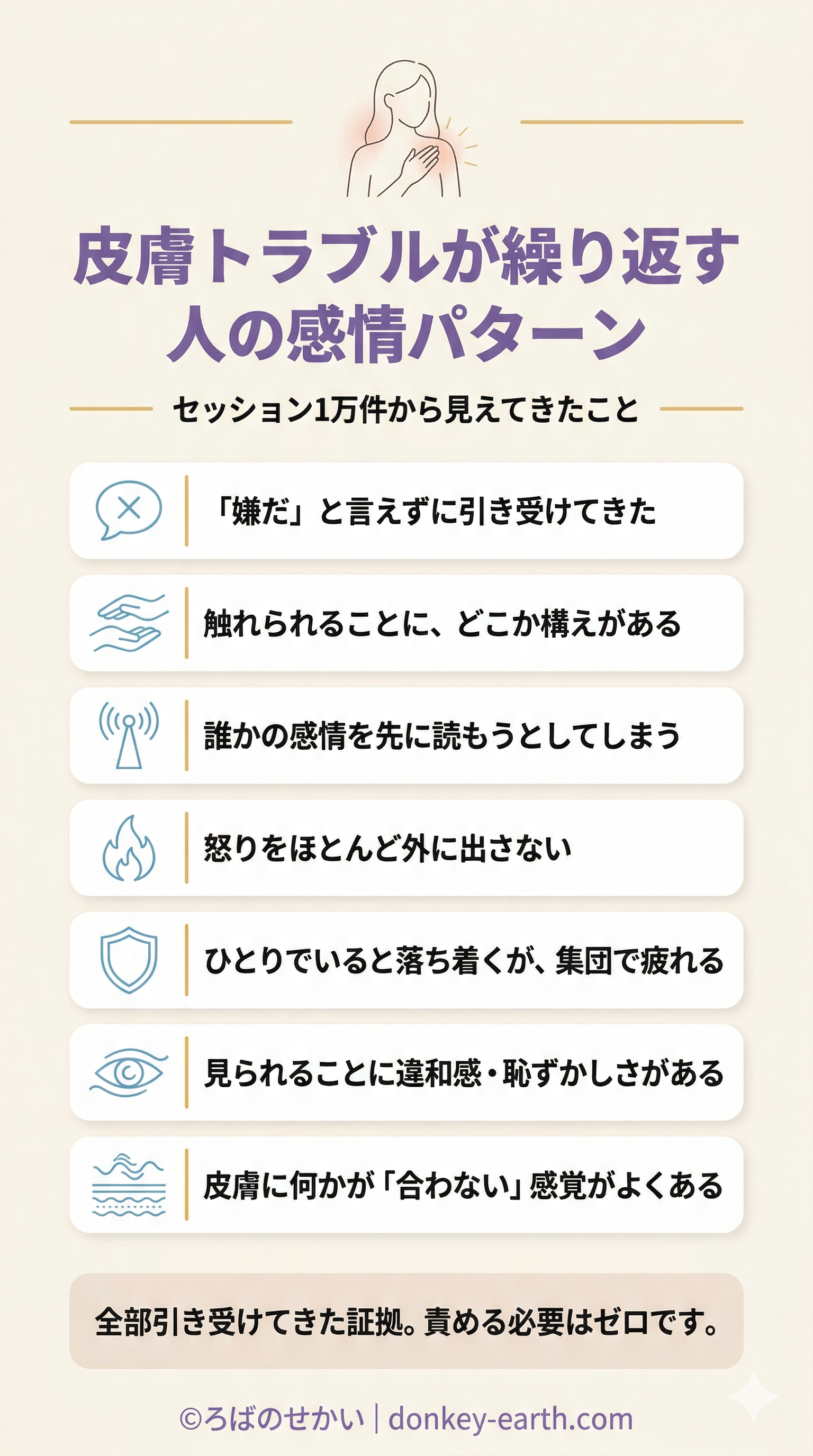 1万件のセッションを通して実感してきたのは、皮膚のメッセージって、遠回しにしか言えないSOSだということです。「嫌だ」とはっきり言える人は、皮膚で言わなくていい。でも、言えない理由があって——過去の体験から、家系から、魂の課題として——だから皮膚が代わりに言っている。そう受け取ると、症状への見方がまったく変わります。