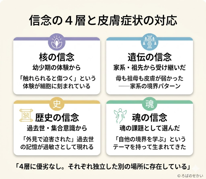 見ている層が違っただけです。同じ皮膚の症状でも、感情層に根っこがある人、遺伝層に根っこがある人、過去世に根っこがある人——それぞれで必要なアプローチがまったく違う。