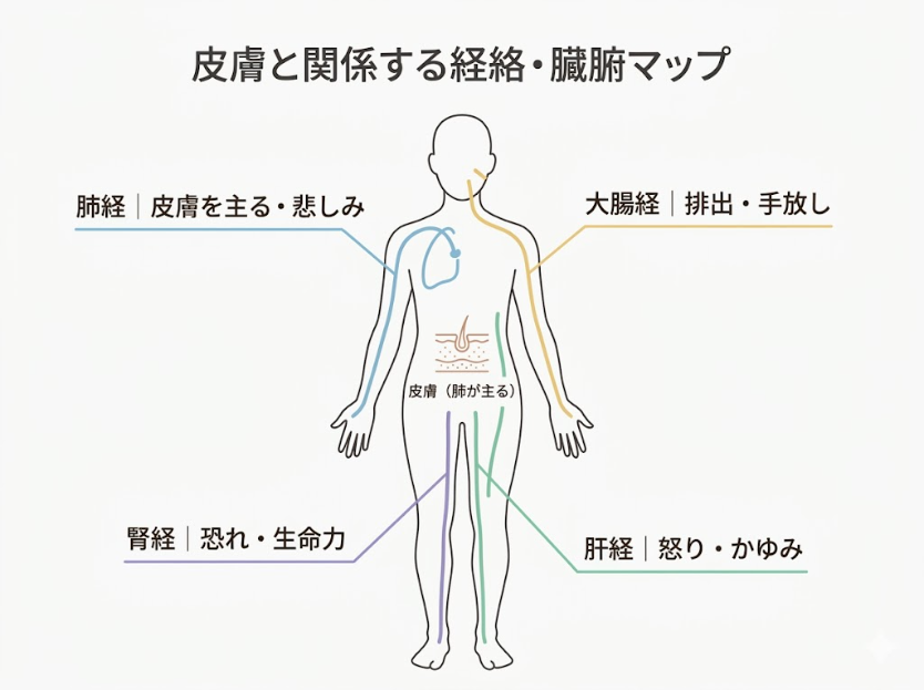 東洋医学では、皮膚は「肺が主る(つかさどる)」とされています。『黄帝内経』には「肺は皮毛を主る」という言葉があり、肺の気が充実していれば皮膚は潤い、弱まれば乾燥・炎症・かゆみとして現れるという考え方があります。
