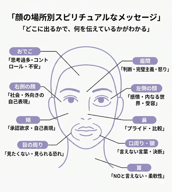 顔の右側・左側・顎・おでこ・頬・首など場所別のメッセージも全部まとめましたので、「なんでここだけ荒れるんだろう」という疑問への手がかりも見つかるはずです。