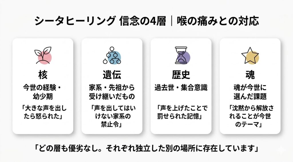 喉の痛みには、感情の層・信念の層・魂の層・創造主の層——それぞれまったく違うメッセージが重なっています。「自己表現できていない」は入口の話であって、根っこではないことが多い。