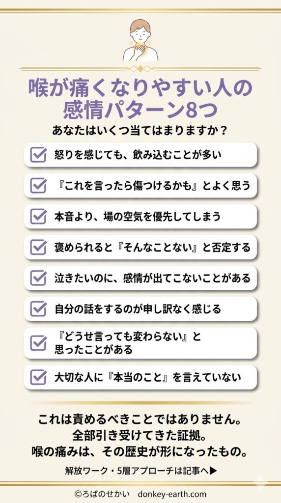 3つ以上引っかかった方——それは責めるべきことではまったくありません。全部引き受けてきた証拠です。喉の痛みはその「引き受けすぎてきた歴史」が形になったもの。自己批判する必要はゼロです。