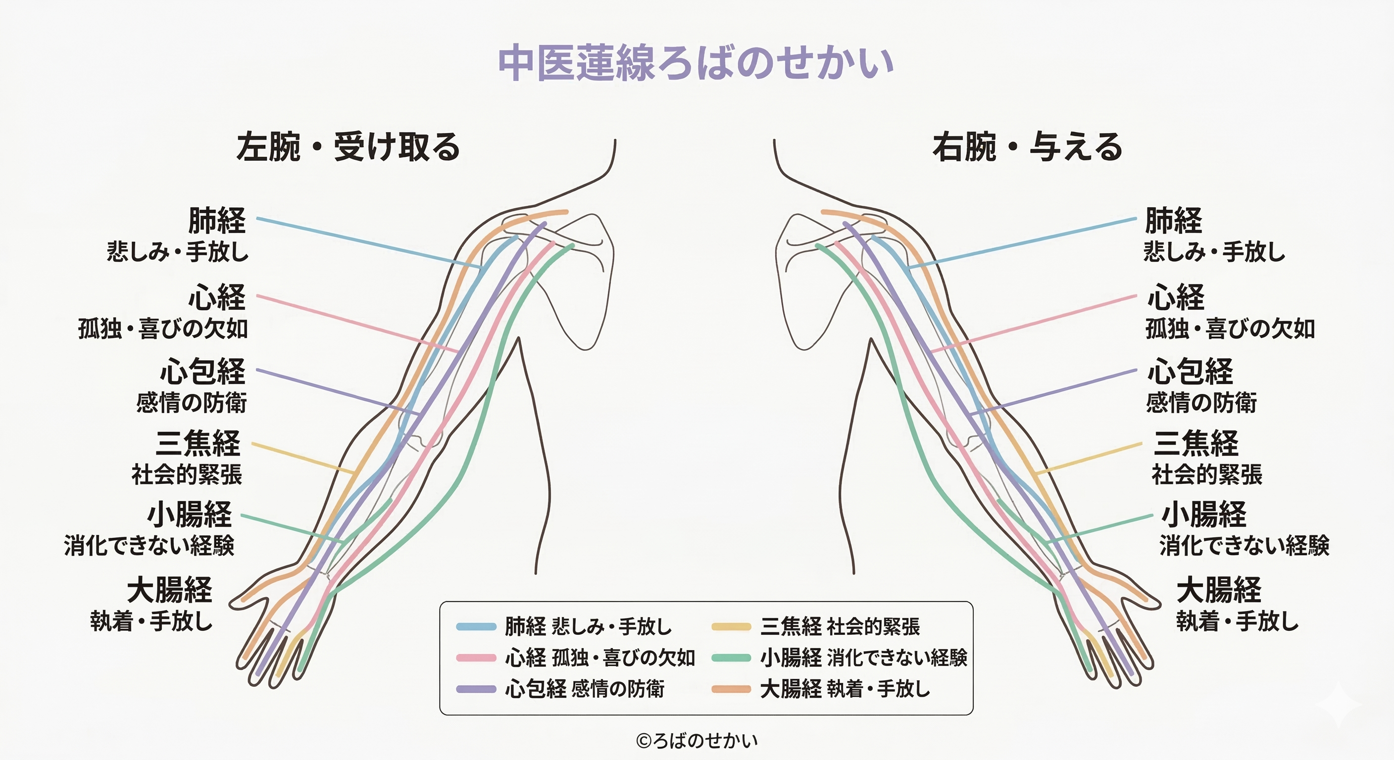 | 左腕の内側(陰経) | 自己愛・自己受容の困難さ。「自分を守っていいのか」という問い |