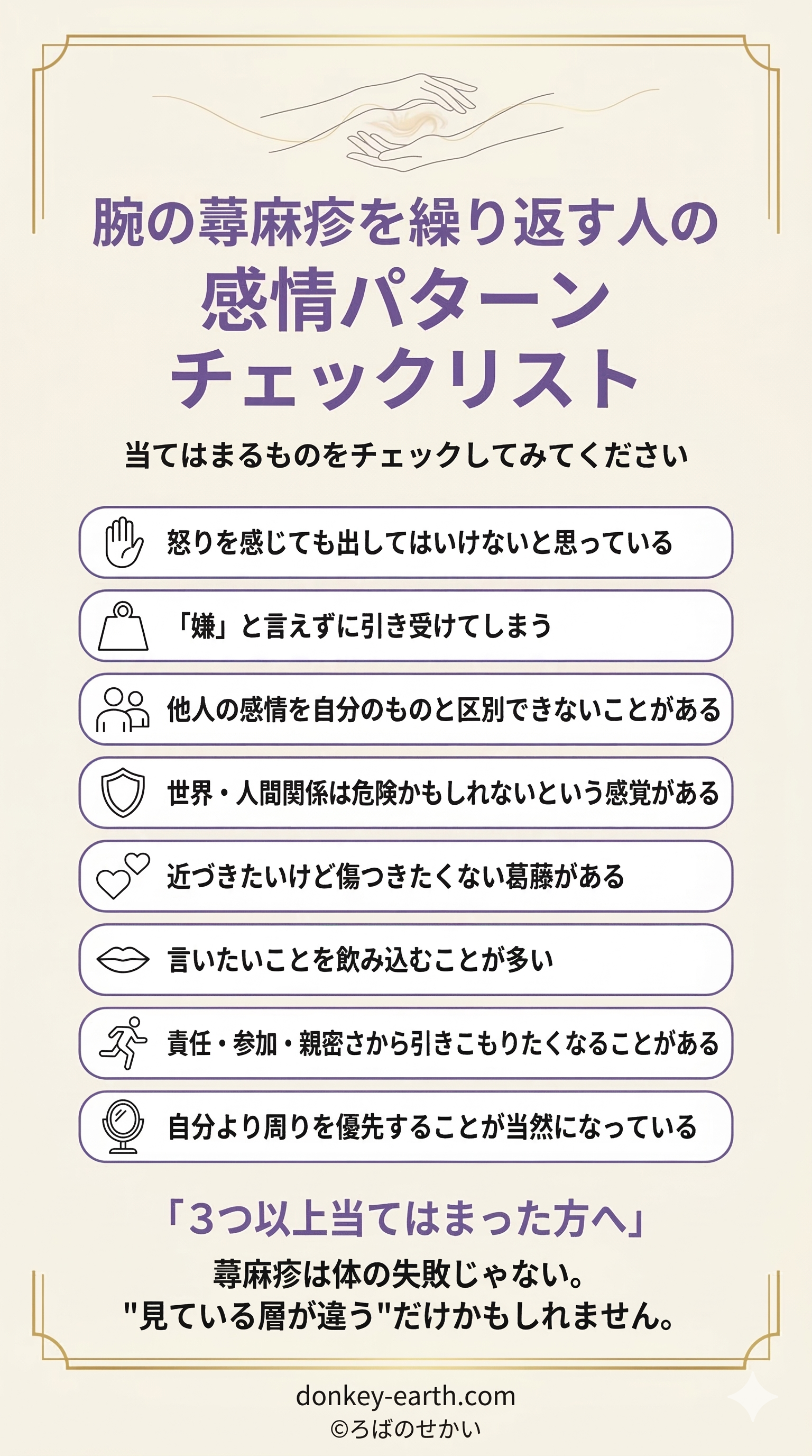 腕の蕁麻疹を「消すべき症状」として見るのをやめて、「何かを感じてほしいというメッセージ」として受け取り始めるとき、何かが変わり始めます。まずは今日、腕に手を当てて問いかけてみてください。「あなたは今、何を守っているの?」と。