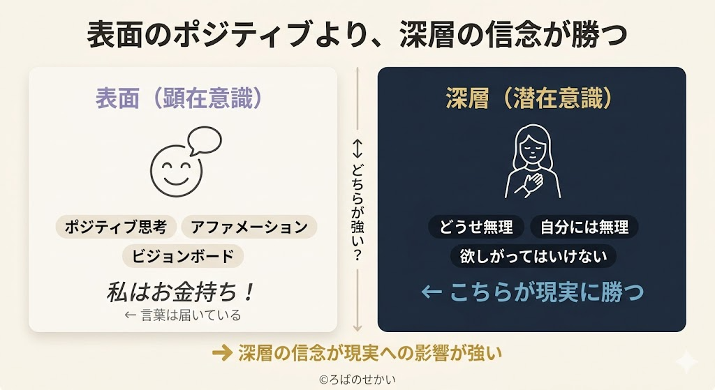 これ、引き寄せにそのまま当てはまります。表面で「私はお金持ち!」と唱えていても、深層に「自分にはそれは相応しくない」という信念がある場合、深層の方が現実への影響が強い。表面的なポジティブより、深層の信念が勝つんです。