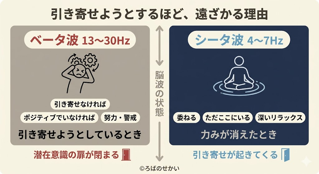 「引き寄せなければ」「ポジティブでいなければ」という状態は、脳波でいうとベータ波(13〜30Hz)の状態です。集中・分析・努力・警戒のとき出る波。