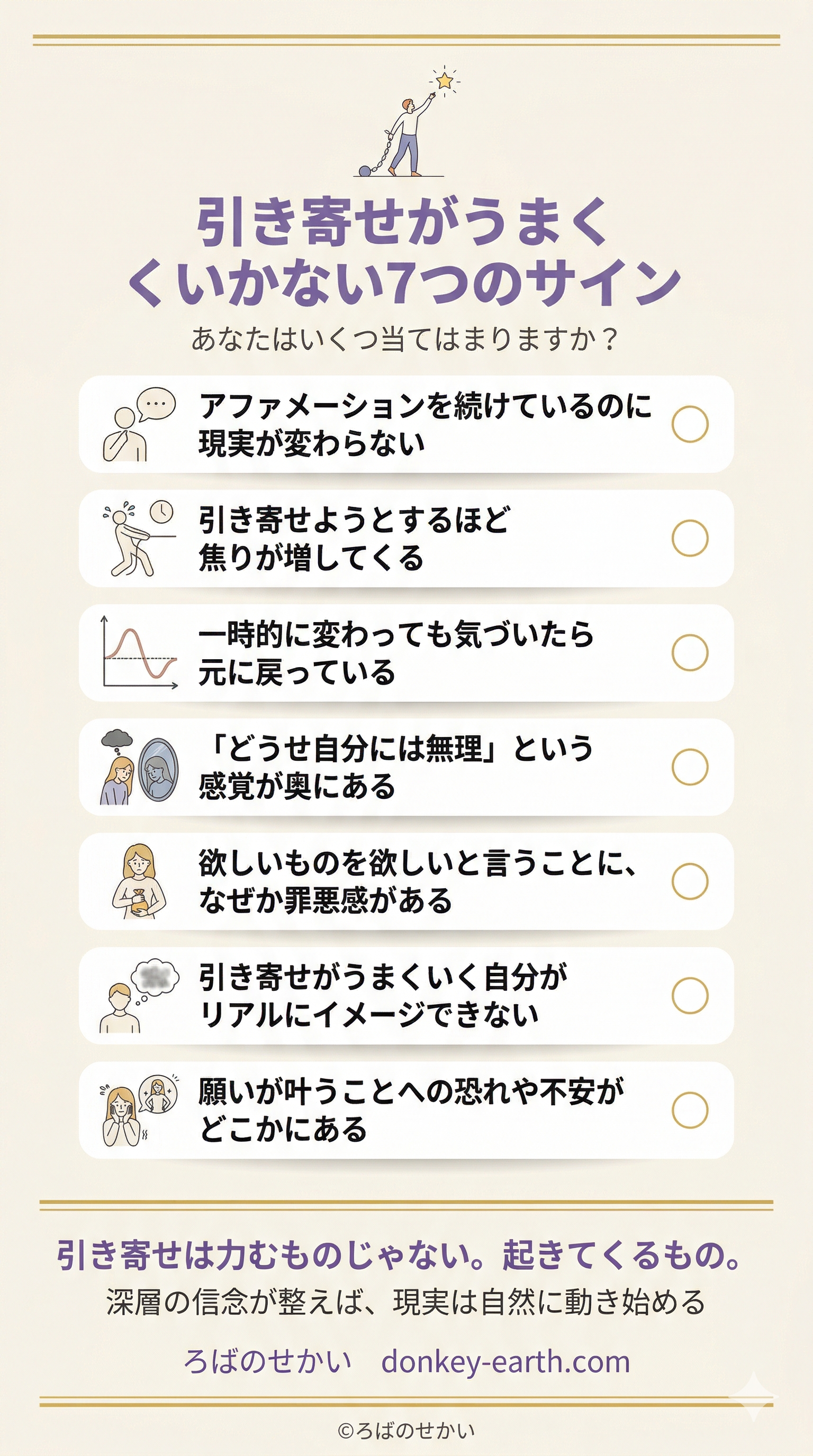 アファメーション、ビジョンボード、「叶った状態をイメージする」——全部やってみた。最初はなんか変わりそうな気がした。でも気づいたら元通り。「自分、引き寄せる気がないのかな」ってため息まじりに思ったこと、ないですか?