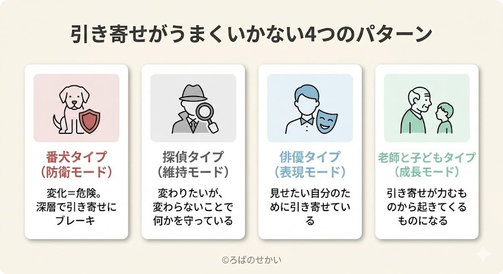 防衛モード(番犬)は「危険を回避しよう」という瞬間の反応です。 維持モード(探偵)は「過去のパターンをもう一度再演しよう」という長期的な力です。 どちらも潜在意識の働きですが、触れる深さと入口が違います。 防衛モードについてはこちらで詳しく書いています。